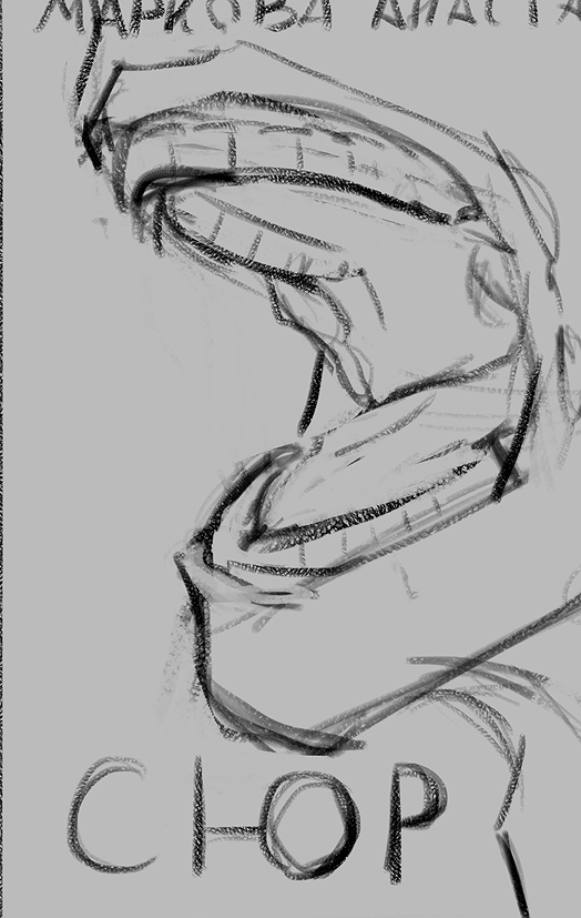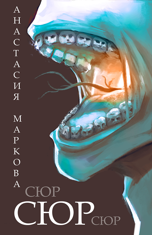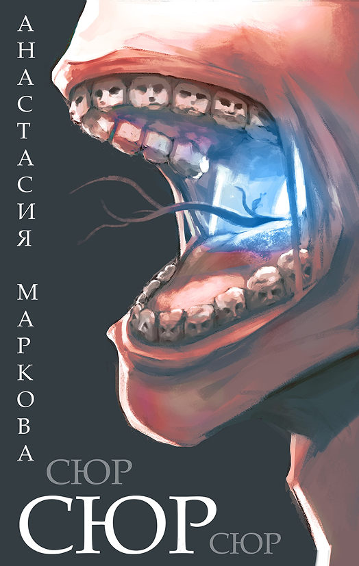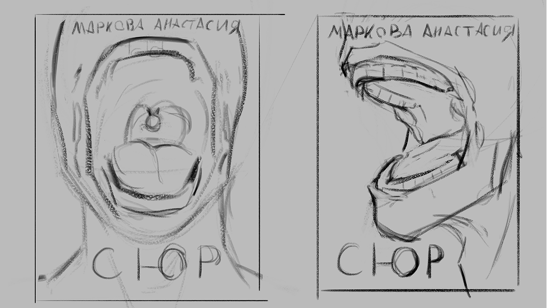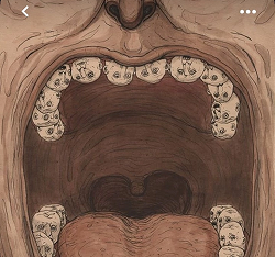 Главным референосм от автора являлся открытый рот с зубами, на которых изображены лица.На выбор было предосталено два скетча, из которых заказчик выбрала второй.